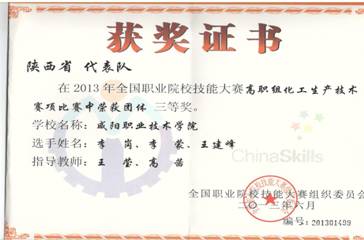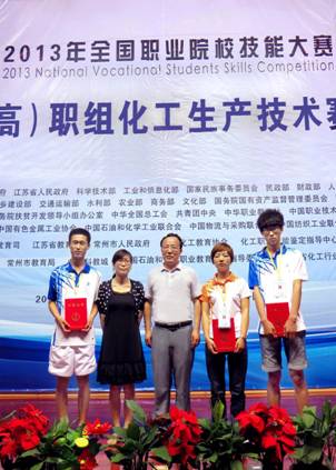 2013年6月13日至16日,全国职业院校技能大赛化工生产技术赛项在常州工程职业技术公司举行,参加本次赛项的高职院校共31个,其中国家示范院校11个,国家骨干院校4个,省级示范院校9个,省级骨干1个。本次大赛只设团体奖,一等奖3名,二等奖6名,三等奖10名,由我系11级员工王建峰、李蒙、李岗组成的公司代表队经过激烈的角逐,最终获得团体三等奖。