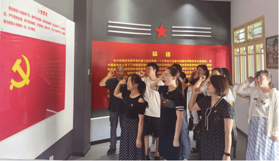 在葛牌镇,全体党员怀着崇敬的心情参观了纪念馆的三个展厅,认真聆听讲解,近距离观看珍贵的历史资料和文物,实地感受到了红二十五军建立鄂豫陕根据地的背景,深入了解红二十五军配合中央红军实施战略转移的战斗历史。一张老旧照片开启一段尘封记忆,一件革命文物诉说一段动人过往。通过现场学习及讲解员的介绍,大家仿佛置身于枪林弹雨的战斗岁月,经历惊心动魄的战斗洗礼,体验缺衣少食的艰苦岁月,深刻认识到革命先烈英勇奋战、顽强拼搏、前仆后继的革命精神和坚定如铁的革命斗志。参观学习结束后,全体党员在纪念馆庄严肃立,面向鲜红的党旗重温入党誓词,用铮铮誓言表达对党的忠诚和热爱。