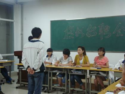 模拟招聘分为自我介绍与现场问答两个环节。活动中,各班在辅导员班主任老师的指导下,由班团干部担任招聘面试官,其他同学分别进入面试室参加招聘面试。