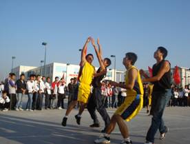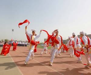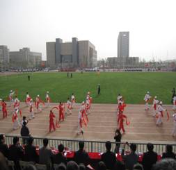 我系安塞腰鼓队在公司运动会开幕式上进行表演