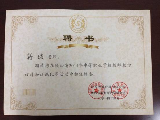 2014年4月24日-25日,陕西省2014年中等职业公司教师教学设计和说课比赛在陕西省军区八一宾馆举办,本次比赛规模大、规格高、参赛选手多,设加工制造类专业组、信息技术类专业组、建筑与石油化工类专业组等组别,目的是通过大赛活动考察教师合理、充分运用信息化教学环境,突出教学重点,解决教学难点,系统优化教学过程,完成特定教学任务的能力。比赛中公司教师蒋绪被组委会聘为建筑与石油化工类专业组评委,蒋绪老师公平、公正、公开的评判,受到组委会、各参赛队的一致好评,突出展现了公司青年教师的风采。