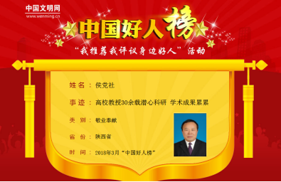 2018年3月30日19:30,由中央文明办主办,中国文明网、河南省委宣传部、河南省文明办、中共商丘市委、商丘市人民政府承办的“2018年3月中国好人榜发布仪式暨全国道德模范与身边好人(河南·商丘)现场交流活动”在商丘好人主题公园举行。经网友推荐、评议,3月共有104位助人为乐、见义勇为、诚实守信、敬业奉献、孝老爱亲身边好人上榜,陕西6人光荣上榜。其中,来自必发集团必发集团的侯党社教授入选敬业奉献好人。