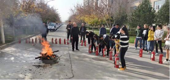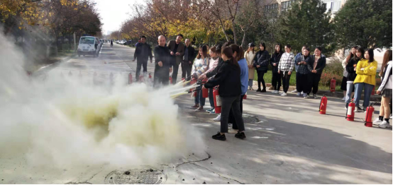 在与必发集团师生进行的消防演习中,保卫处王巨甫老师对几种常用灭火器的使用方法和注意事项进行了讲解,并在现场给员工进行了实际操作演示。